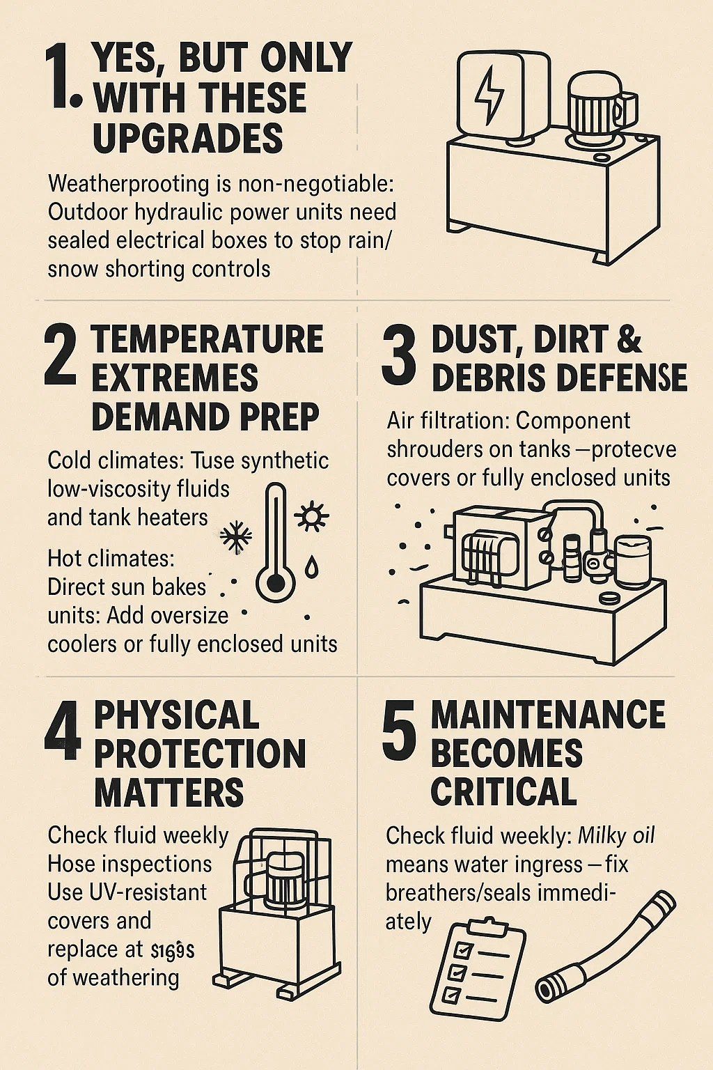 Air filtration: Outdoor hydraulic power units need desiccant breathers on tanks – not basic caps. Stops dust and moisture mixing with oil.