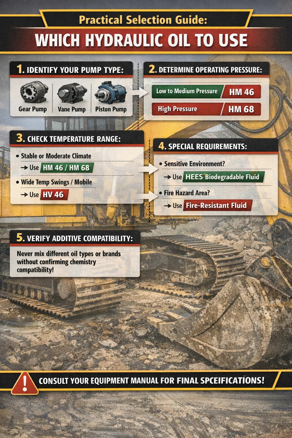 Never mix hydraulic oil brands or types without confirming additive compatibility with both manufacturers. Even two HM46 oils from different suppliers can contain incompatible additive chemistry.