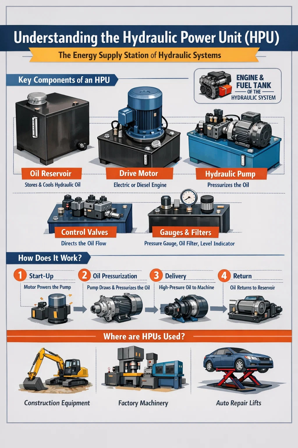 In a hydraulic system, cylinders (for extension and retraction) or motors (for rotation) alone are not enough; they need pressurized oil to operate. The task of the hydraulic power unit (HPU) is to convert ordinary electrical or mechanical energy into this pressurized "power oil."